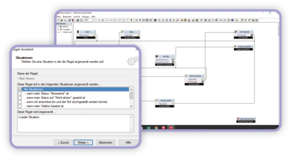 Der integrierte Call Routing Manager ermöglicht es Ihnen, Anrufe automatisch zu einer gewünschten Rufnummer, wie z.B. einer Mobilfunknummer oder Rufnummer eines anderen Mitarbeiters, umzuleiten, wenn Sie den Ruf selbst nicht annehmen können. Intelligente Rufumleitungen auf Basis von Kalenderinformationen oder Ihres Status machen das manuelle Aktivieren oder Deaktivieren von Umleitungen unnötig: Swyx weiß, ob ein Benutzer gerade erreichbar ist oder nicht. Mit dem integrierten Regelassistenten können Rufweiterleitungen zudem in Abhängigkeit von bestimmten Uhrzeiten, Wochen- oder Feiertagen realisiert werden.
